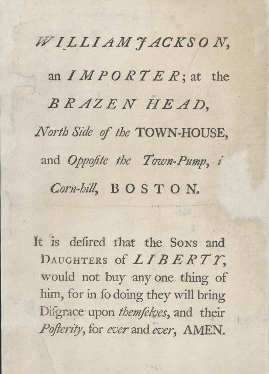 | Broadside attacking a Boston merchant for violating the non-importation agreement (from Mass. Historical Society) |